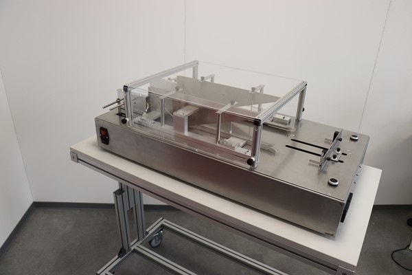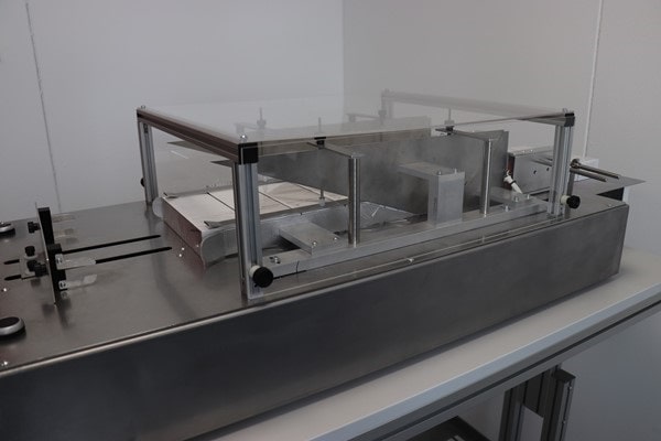 Une fois que l’unité est chauffée, vous placez votre produit, déjà soudé sur un côté, dans le système de pliage. Vous lancez alors le processus en appuyant sur les deux boutons en même temps. Le produit est propulsé en avamt, la feuille de cellophane est pliée puis soudée avec précision.